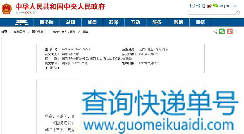 获悉,3月20日,国务院办公厅发布了《国务院2017年立法工作计划》(以下简称《计划》)。《计划》明确提到要将“保障快递安全,保护用户合法权益”等列入2017年立法工作计划。具体为,为了保障快递安全,保护用户合法权益,加强对快递市场的监督管理,促进快递业健康发展,制定快递条例(交通运输部、邮政局起草)。